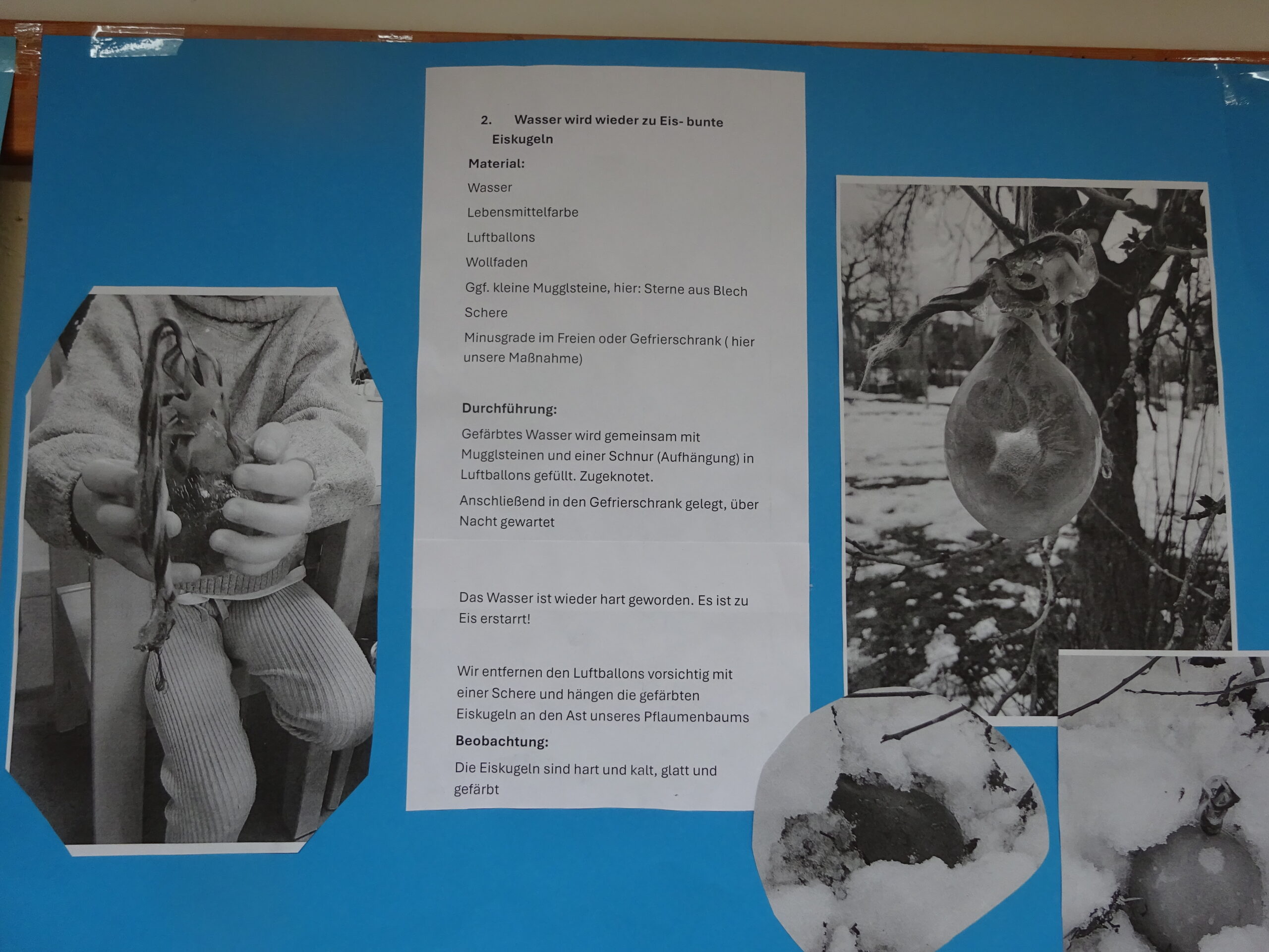 Besonders spannend ist es für die Kinder gewesen, gefärbtes Wasser in Luftballons einzufüllen und bunte Eiskugeln für den Baum herzustellen.
